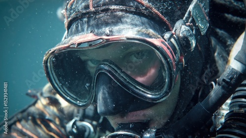 Underwater Diver Close-Up: A Scuba Diver's Intense Gaze
