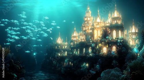 Underwater fantasy castle scene with fish and coral reef.