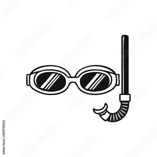 Underwater Goggles and Snorkel. Clean graphic of white swim eyewear with breathing apparatus on dark background. Evokes themes of exploration, freedom, and marine leisure.