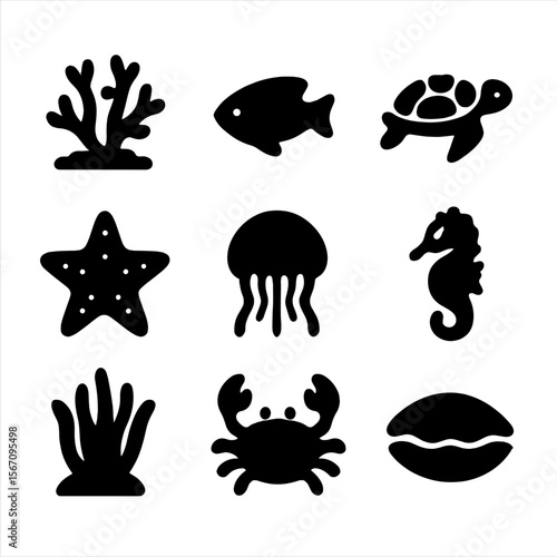 Underwater Icon Set. Solid, filled icon set of underwater life: coral reef, fish, sea turtle, starfish, jellyfish, seahorse,