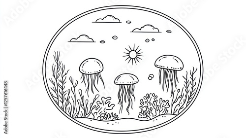 Underwater jellyfish scene, ocean life, sunny day, circular design, coloring page