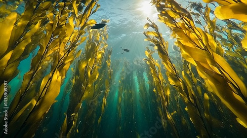 Underwater kelp forest bathed in sunlight, showcasing vibrant yellow algae.