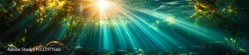 Underwater Kelp Forest with Sunbeams Piercing Through the Water and Casting Shadows. Generative AI