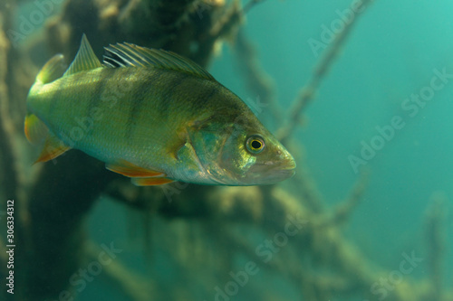 Underwater photo of Perca fluviatilis, commonly known as the common perch, European perch, in Soderica Lake, Croatia