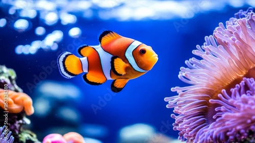 Underwater scene aquarium clownfish center orange white black a group of clown