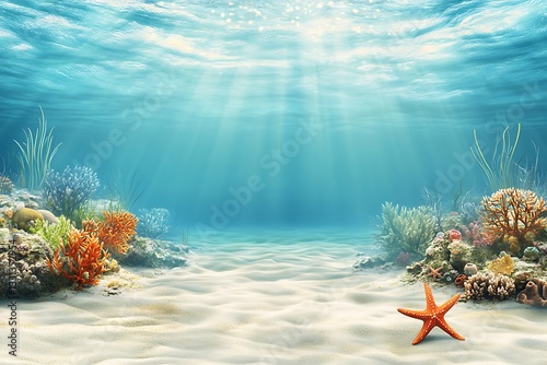 Underwater scene of coral reef, starfish on sand, sun rays shining down, for design