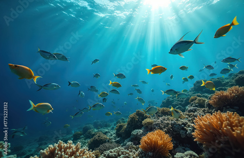 Underwater scene shows school of fish swimming over coral reef. Sun rays penetrate water. Tropical fishes swim in blue ocean. Marine ecosystem flourishes with vibrant coral life. Oceanic wildlife