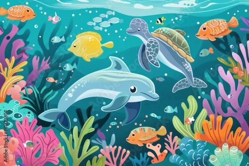 Underwater Scene with a Dolphin, Turtle, and Fish