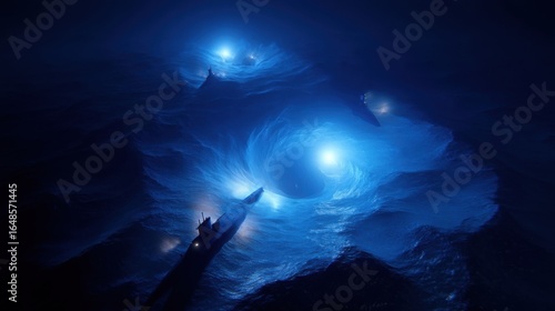 Underwater scene with ships navigating rough waves, glowing blue engine trails creating whirlpool effects,
