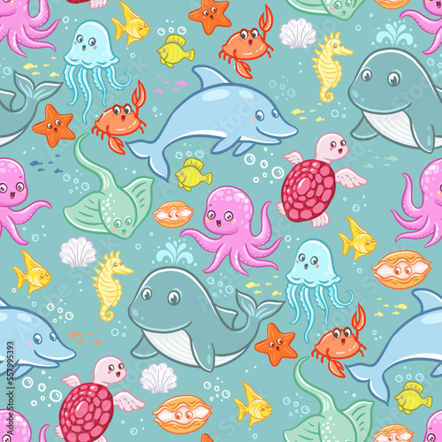 Underwater sea animals. Seamless pattern with vector hand drawn illustrations