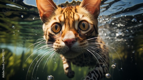 Underwater shot capturing a Bengal cat swimming