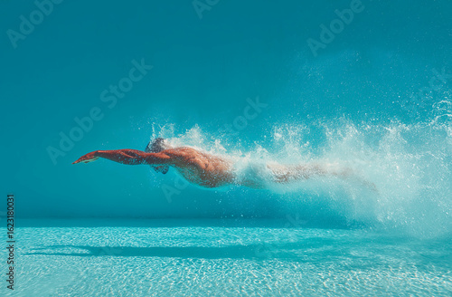 Underwater shot of a man swimming in a pool with splashes