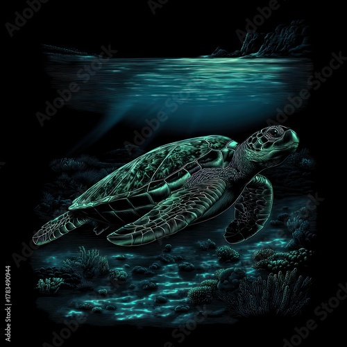 Underwater turtle illustration featuring aquatic marine wildlife and ocean depth