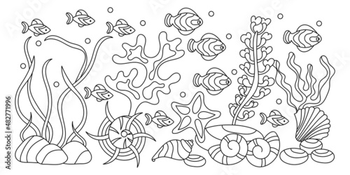 Underwater world coloring pages. Algae fish shells. Hand-drawn Vector coloring book, background