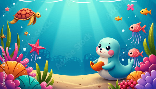 Underwater-scene-cute-seal-turtle-fish-colorful-cartoon-illustration