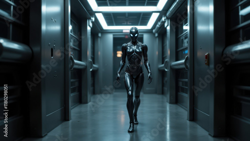 Undetectable AI with human-like appearance walking through dimly lit industrial setting.