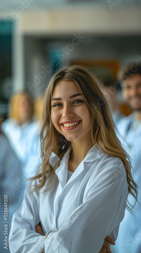 Une femme souriante en blouse blanche avec les bras croisés devant des collègues.