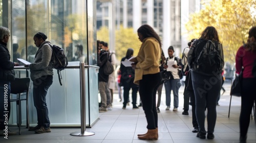 Unemployment line at a busy downtown office. Featuring struggle and determination