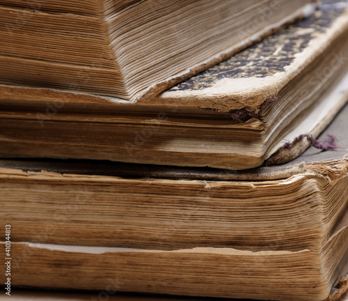 uneven corner of old books with brown textured paper and torn cover.vintage paper texture. selective focus. High quality photo