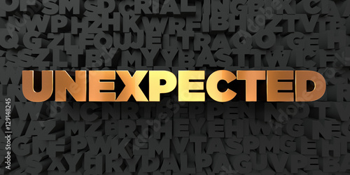 Unexpected - Gold text on black background - 3D rendered royalty free stock picture. This image can be used for an online website banner ad or a print postcard.