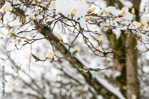 unexpected cold snap. Snow on flowering trees, white magnolia flowers in the snow close up