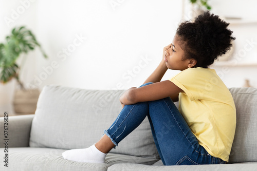 Unhappy Black Kid Girl Sitting On Couch At Home Alone