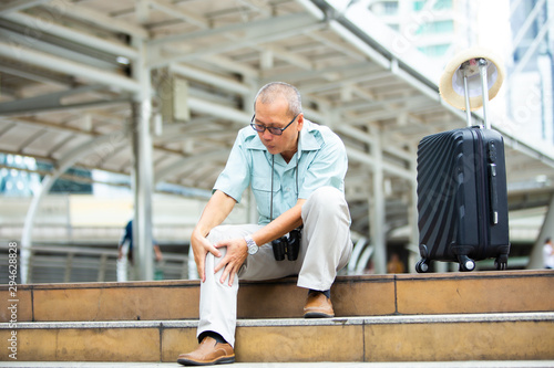 unhappy senior man suffering from knee ache. Travel and tourism concept.health problem and people concept.