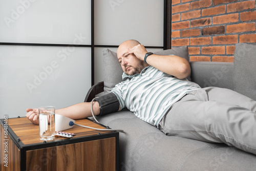 Unhealthy young man suffering from hypertension and headache, lying on the sofa at home, measures blood pressure on his hand with modern digital tonometer
