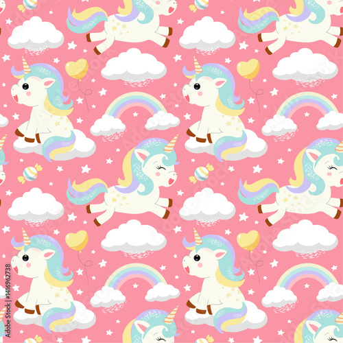 unicorn baby seamless pattern, magical birthday cute cover, background, wallpaper, print, textile, ornament, fabric, clothing, wrapping paper, decor, vector