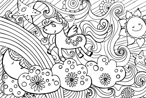 unicorn clouds sun rainbow beautiful fun hand drawn Doodle coloring book cover print