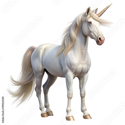 Unicorn with a long white mane stands on a white background. On transparent background. Png file