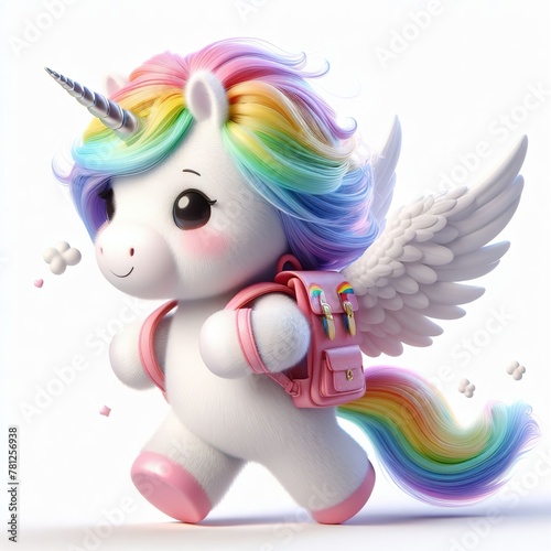 unicorn with white wings and rainbow mane carrying a backpack on the way to school