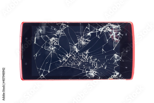Unidentified brand of Smartphone mobile phone with Broken Screen glass. Old used touch screen gadget