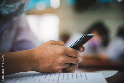 Uniform students are test exam and study online by using smartphone and wearing protective facemask in classroom