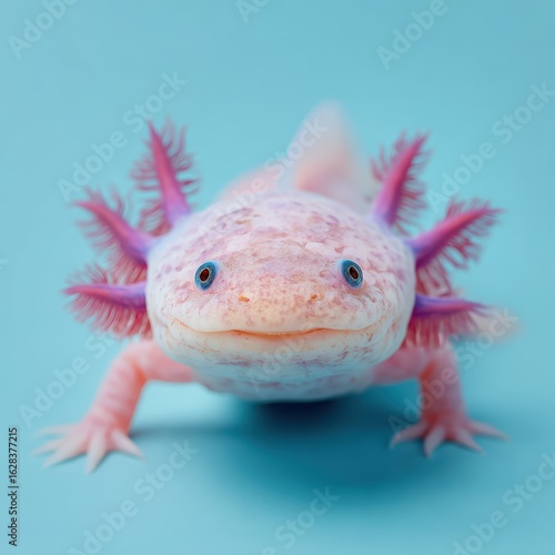 Unique and Colorful Axolotl with Bright Pink Gills on Blue Background in a Close-Up View
