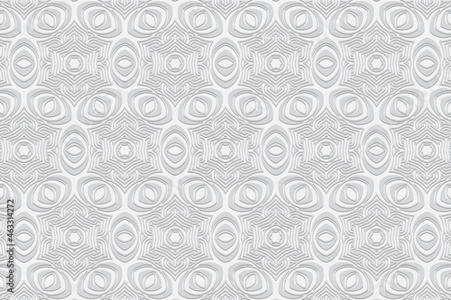 Unique banner, cover design, white background. Geometric volumetric convex ethnic elegant 3D pattern. Eastern, Indonesian, Mexican, Aztec style.