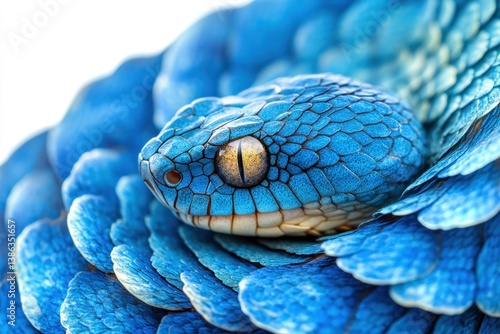 Unique blue snake coiled elegantly against a smooth white surface showcasing intricate scales and captivating eyes