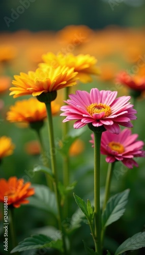 Unique chrysanthemum stems with long yellow and pink flowers, chrysanthemums, field flowers, nature