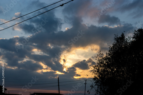 Unique dramatic gray clouds on dark sky at sunset time. tree and wires
