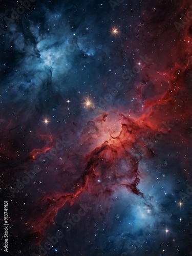 Unique space illustration background red and blue themed nebulas and interstellar clouds with stars in distance