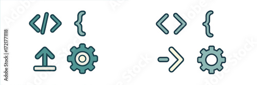 Unique symbols used in coding and programming, showcasing arrows, gears, and brackets on a white background