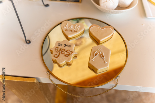 Unique wedding proposal cookies displayed on a stylish mirror tray during a joyful celebration at a sunny outdoor venue