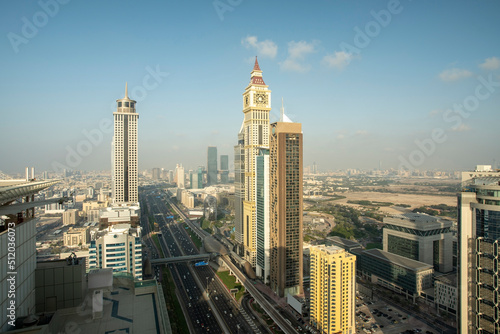 United Arab Emirates, Dubai, Sheikh Zayed Road stretching between tall downtown skyscrapers