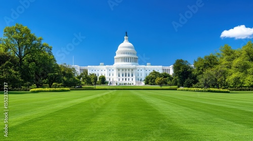 United States Capitol Building Against Clear Blue Sky with Lush Green Lawn