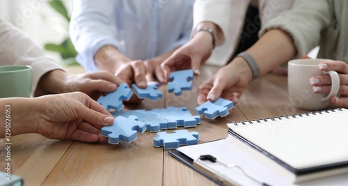 Unity concept. People putting puzzle pieces together at wooden table indoors, closeup