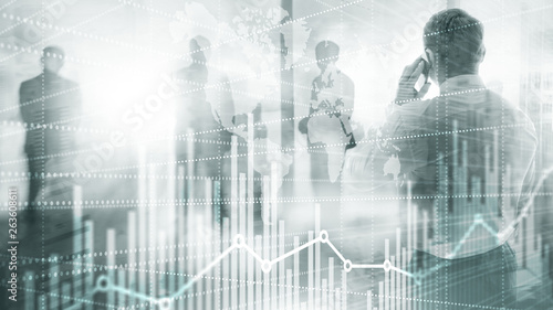 Universal Abstract background. Silhouettes of Business People. Economic growth graph chart. Double exposure mixed media.