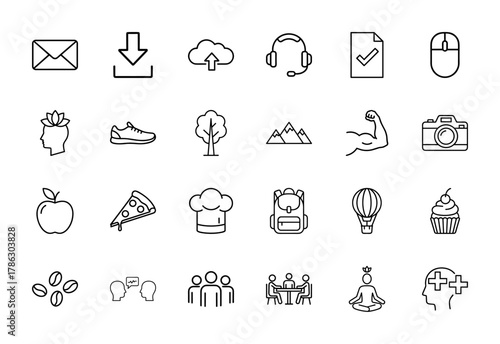 Universal line icon set. Vector pictograms of email, cloud, headphones, document, camera, tree, pizza, backpack, and diverse people, thin linear illustration.