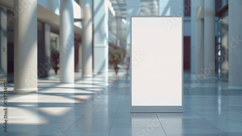 Universal template mockup of a blank white vertical advertising banner, in shopping centers or showrooms. Generative AI