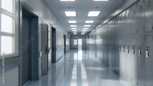University Hallway. School Corridor with Lockers in 3D Illustration