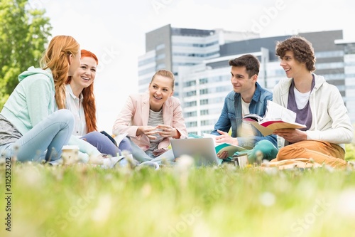 University students studying together on grass
